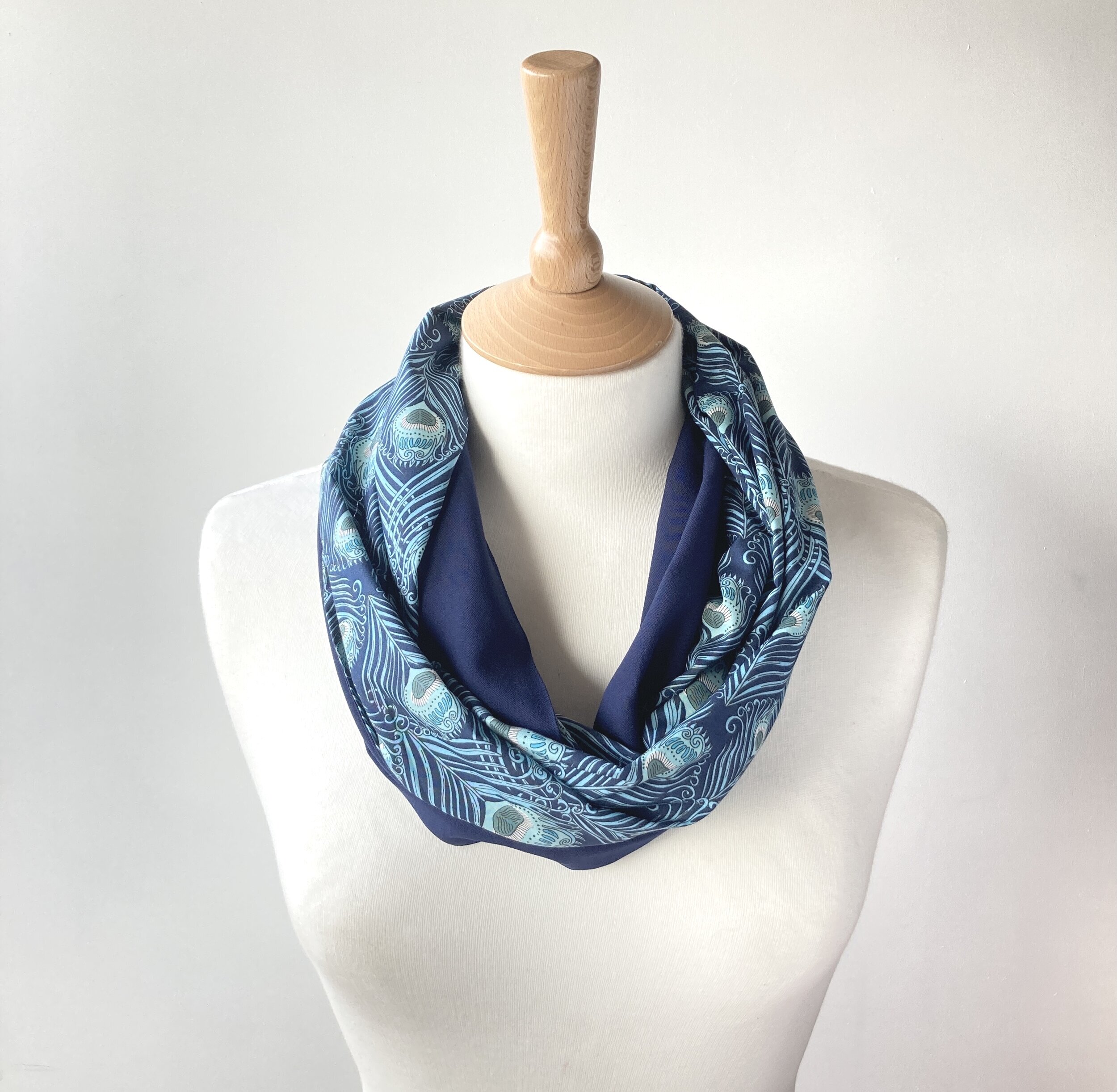 A lovely soft scarf in a continuous loop, with the gorgeous Liberty Caesar peacock feather cotton tana lawn on one side and a plain navy soft and drapey viscose on the reverse.